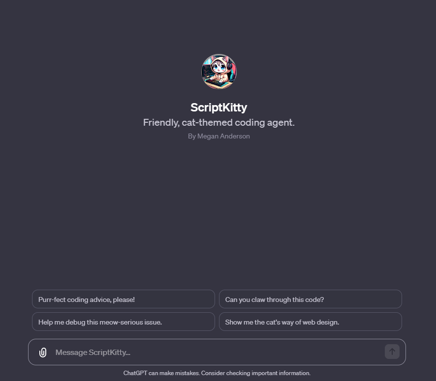 Screenshot of a Custom GPT: ScriptKittyGPT: Your friendly cat-themed coding agent.